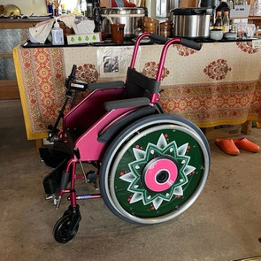 車いすのスポークカバーに、点描曼荼羅画を手描きします。